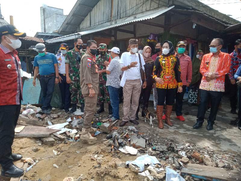TULANGBAWANG – Bupati Tulangbawang, Dr. Winarti tinjau pasar Unit II, Banjaragung pasca kebakaran beberapa hari yang lalu.