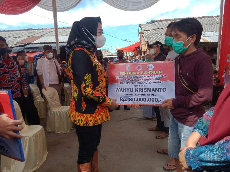 Bupati Tulangbawang, Dr. Winarti mengatakan, Bantuan yang Pemkab berikan kepada pedagang yang terkena langsung dengan kerugian 10 kios besar hangus terbakar dan 4 orang pedagang amperan.