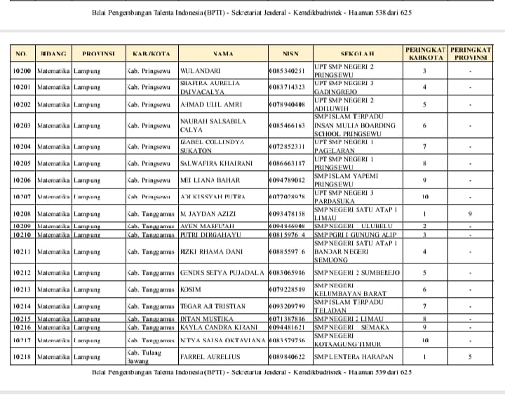 TANGGAMUS – Siswa Sekolah Menengah Pertama (SMP) PGRI, Gunungalip, Kecamatan Gunungalip, Kabupaten Tanggamus, Putri Dirgahayu dengan nomor peserta 10210 sabet juara 3.