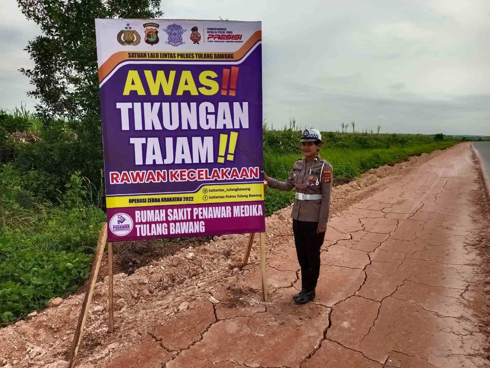 TULANGBAWANG – Unit Keamanan Keselamatan Berlalulintas (Kamsel) Satuan Lalu Lintas (Satlantas) Polres Tulang Bawang, Polda Lampung, memasang banner imbauan di lokasi rawan terjadinya kecelakaan.