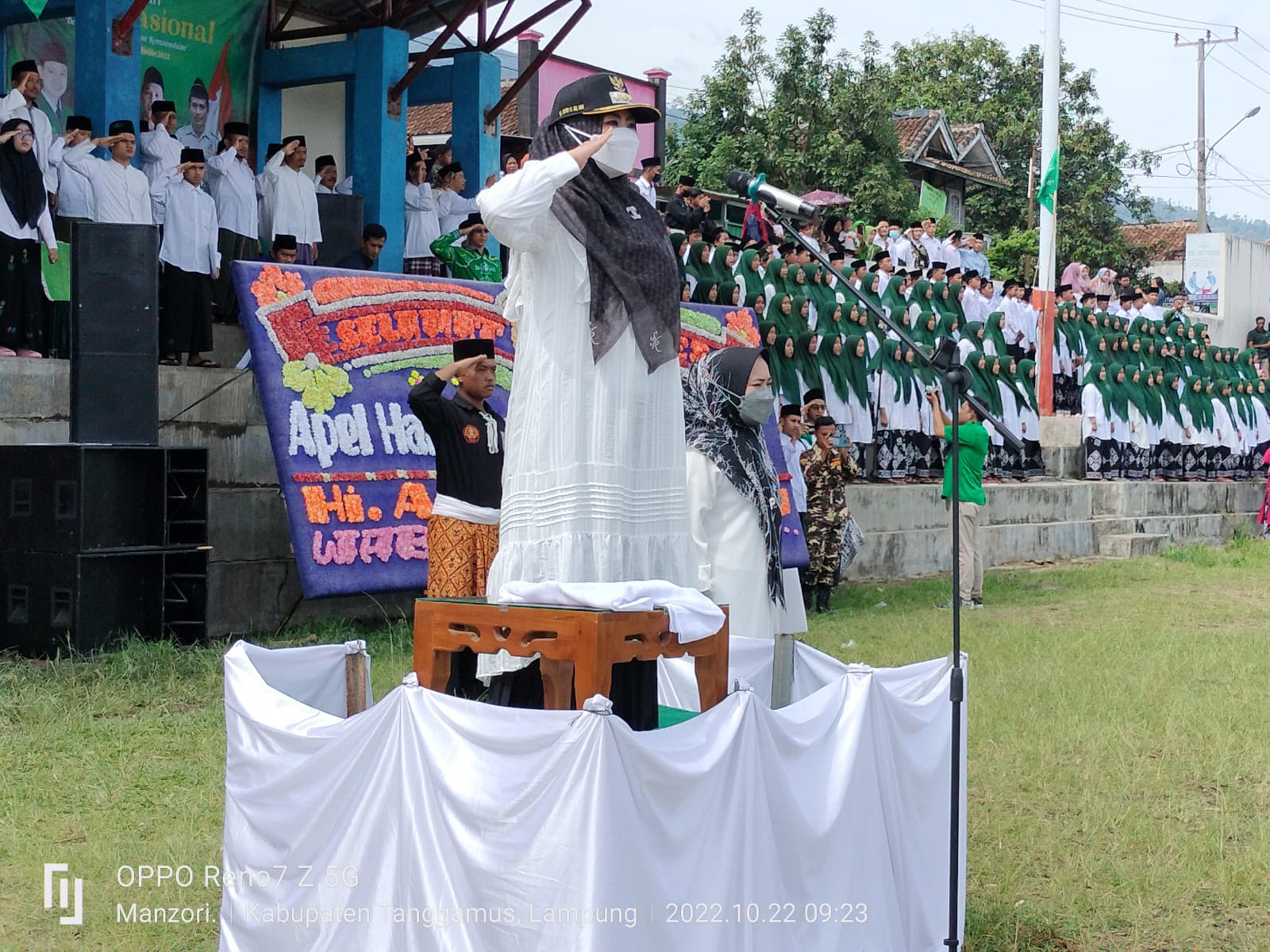 SUMBERREJO – Bupati Tanggamus Hj. Dewi handajani menghadiri Apel santri guna memperingati Hari Santri Nasional (HSN) 2022 PCNU Kabupaten Tanggamus, kegiatan dipusatkan di lapangan Margoyoso Kecamatan Sumberrejo, kabupaten setempat, Sabtu (22/10/2022).