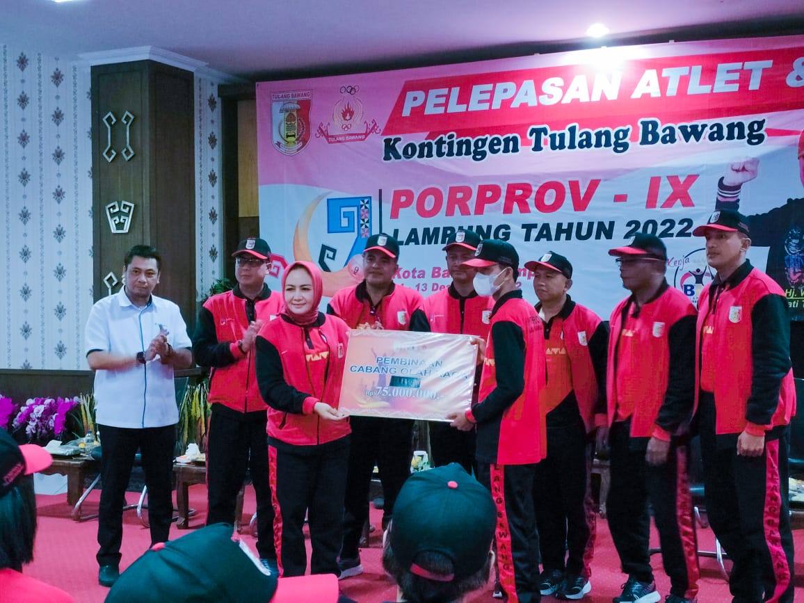 TULANGBAWANG – Bupati Tulangbawang (Tuba) Hj Winarti lepas para atlet Porprov Lampung ke-XI Tahun 2022 asal Kabupaten Tulangbawang. Kegiatan berlangsung di Ruang Rapat Utama (Rupama) Lantai II Sekdakab kabupaten setempat, Senin (28/11/2022).