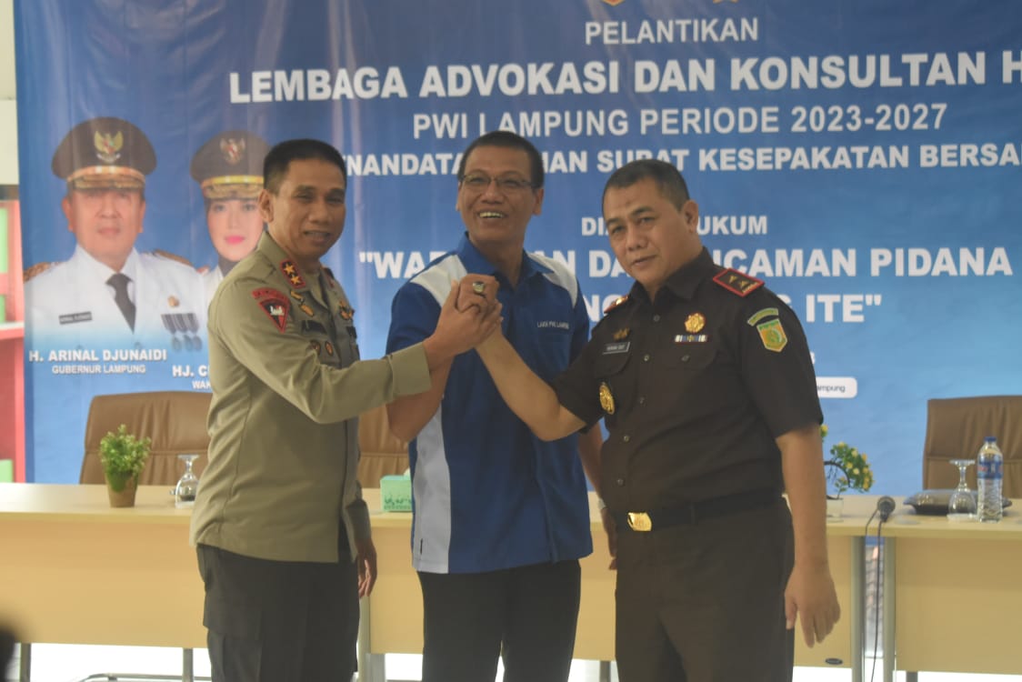 Kesepakatan tersebut ditandai dengan penandatanganan Surat Kesepakatan Bersama (SKB) oleh Kapolda Lampung Irjen Pol Akhmad Wiyagus, Kepala Kejati Lampung Nanang Sigit Yulianto, dan Ketua PWI Lampung Wirahadikusumah di Balai Wartawan H. Solfian Akhmad, Kamis (16/3/2023).