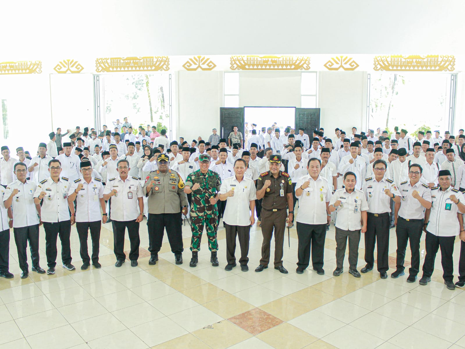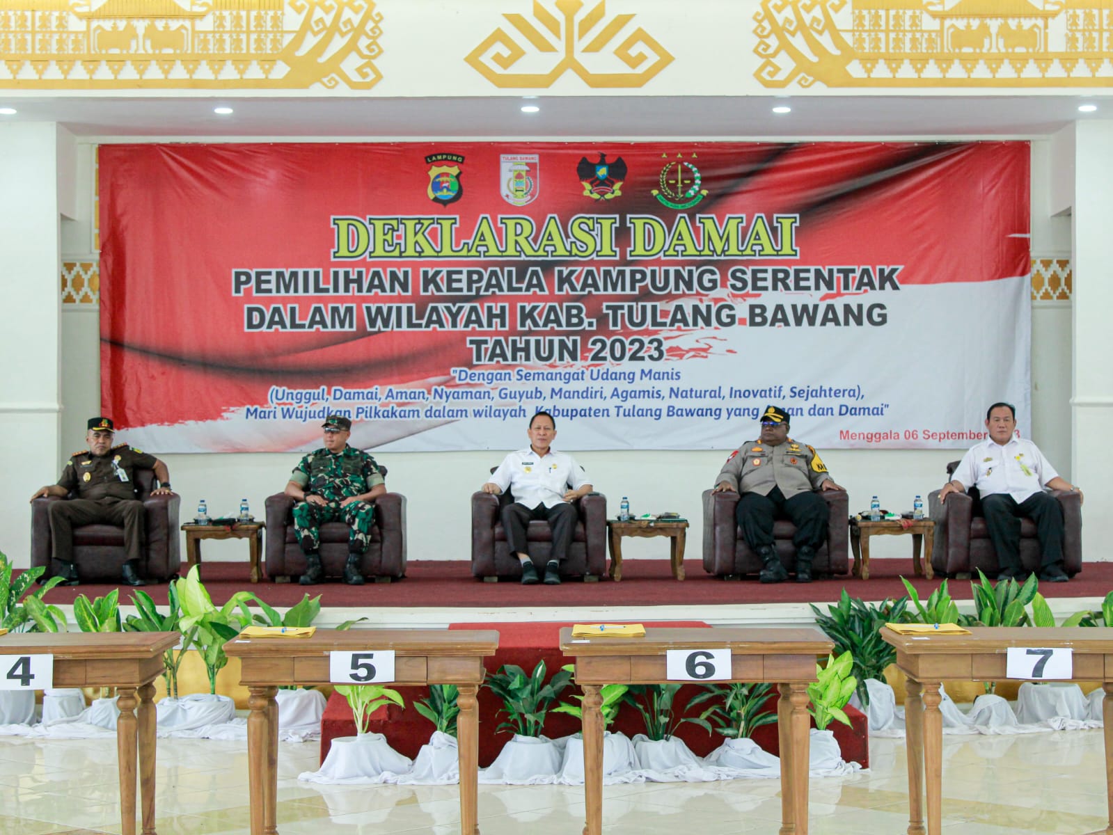 TULANGBAWANG – Penjabat (Pj) Bupati Tulangbawang (Tuba) Qudrotul Ikhwan MM menghadiri deklarasi damai pemilihan kepala kampung (Pilkakamp) serentak Tahun 2023 di wilayah setempat, kegiatan deklarasi tersebut dilaksanakan di GSG Menggala, Rabu, (06/09/2023).