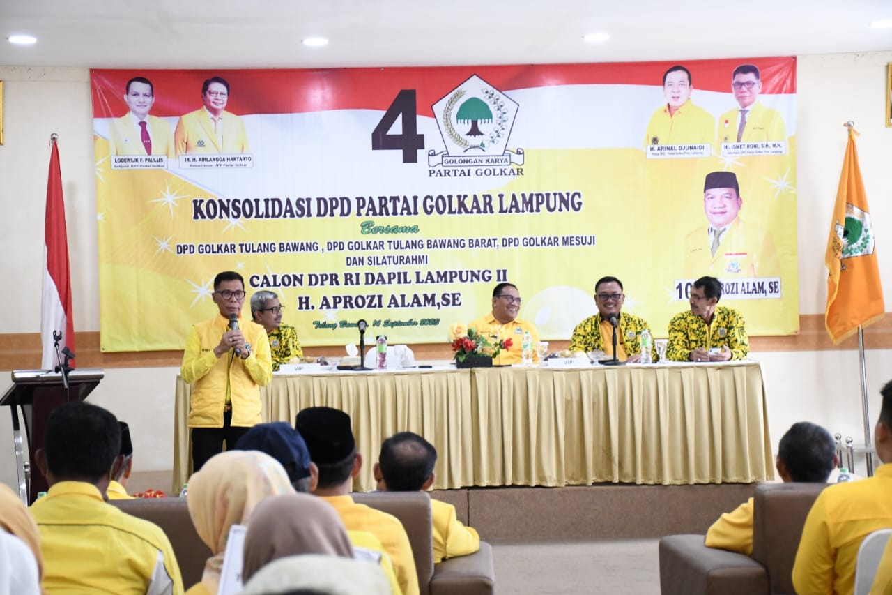 Hal tersebut, ditegaskan Sekretaris DPD Golkar Lampung, Ismet Roni dalam rangka acara Konsolidasi DPD Partai Golkar Lampung, bersama DPD II Golkar Tulangbawang, DPD II Tulangbawang Barat, DPD II Mesuji, sekaligus silaturahmi Caleg Dapil Lampung II H. Aprozi Alam, dihelat di Ballroom