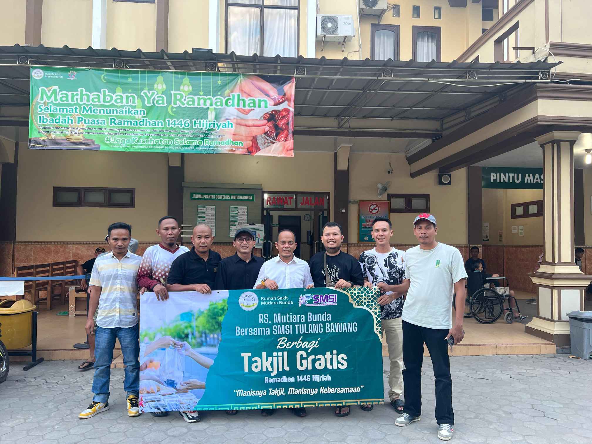 TULANGBAWANG – Rumah Sakit Mutiara Bunda (RSMB) bersama Serikat Media Siber Indonesia (SMSI) Tulangbawang membagikan takjil buka puasa di jalan lintas timur, depan rumah sakit setempat, pada Rabu (26/3/25).