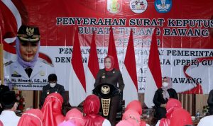 TULANGBAWANG – Pada sesion kedua, Bupati Tulangbawang, Winarti, secara langsung membagikan Surat Keputusan (SK) Pegawai Pemerintah dengan Perjanjian Kerja (PPPK) guru atau