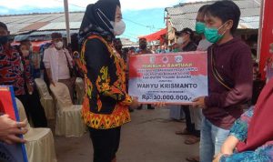 TULANGBAWANG – Bupati Tulangbawang, Dr. Winarti tinjau pasar Unit II, Banjaragung pasca kebakaran beberapa hari yang lalu. Winarti memberikan bantuan uang tunai